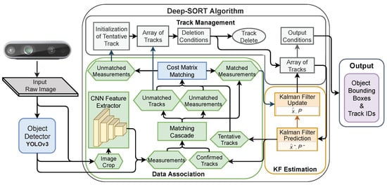 SORT [10] iteratively computes the state of the objects being tracked through a KF. The method uses the Hungarian algorithm [34] to accurately associate detected objects (by an object detector) with objects that are being tracked. A detailed overview of the SORT algorithm is represented in Figure 2.