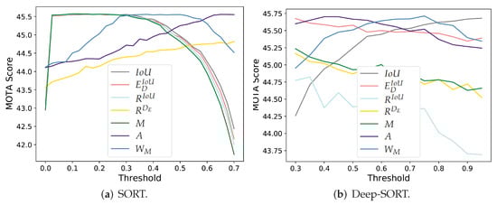 An evaluation of SORT and Deep-SORT, where the data association threshold is modified, was also performed on the MOT17 dataset, whose results are presented in Figure 4. As expected, as the threshold value increased, the MOTA score decreased for the majority of the cost matrices. As observed, no threshold value was found to be suitable for all evaluated cost matrices. Hence, the best results were obtained using a threshold value of 0.3, which was thereafter used for all the evaluations.