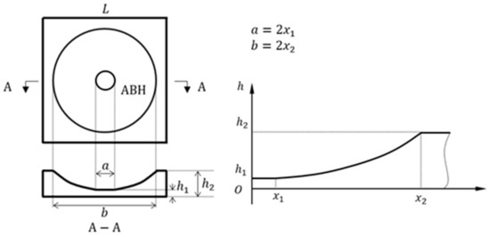 According to existing machining capability, an ideal ABH structure is impossible to be realized. Therefore, typical two-dimensional ABH structures usually contain a hole or a circular plateau of constant thickness at the center of the indentation [12], that is, there must be a residual thickness at the bottom of the ABH indentation. The profile of a two-dimensional ABH indentation is schematically shown in Figure 2. In this paper, two-dimensional ABHs are embedded in a uniform plate with thickness of and the geometry dimension of the plate is 0.5 m × 0.5 m × 0.004 m (length × width × thickness). The outer radius of ABH is , the thickness of the central plateau (residual thickness) is , its radius is and the power index is set as 2.2, then the variable can be calculated. The thickness profile of ABH can be described as: