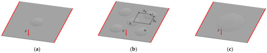 According to Equation (2), an ABH indentation with a larger radius will have lower cut-on frequency and may have better energy focalization performance at lower frequency. To investigate the potential advantages of the ABH array at lower frequency, 3 plate models are established, as shown in Figure 3. That is, a plate with a single ABH (Figure 3a), a plate with an array of five ABHs (Figure 3b) and a plate with a big ABH (Figure 3c). Parameters and of the big ABH (Figure 3c) are the same as those of the small ABH (Figure 3a). In addition, Radius of the big ABH is 0.1342 m to ensure that the plate with a big ABH has the same mass as the plate embedded with 5 ABHs.
