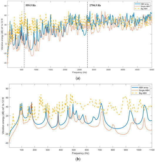 Vibration energy comparison among three ABH plate configurations. (a) 5–5000 Hz, (b) 5–1050 Hz.