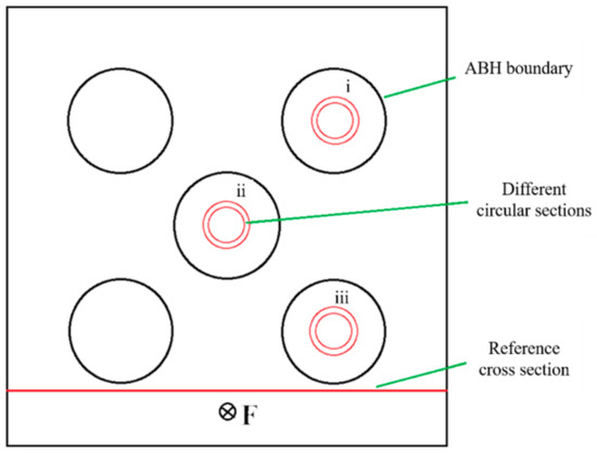 As the ABH array structure is symmetrical, this paper focused on three typical ABHs in Figure 3b, named ABH(i), ABH(ii) and ABH(iii), respectively. The center of ABH(ii) is located on the center of the whole plate structure, and the coordinates of ABH(i) are