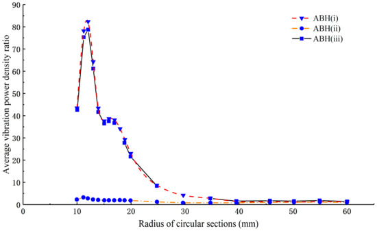 Additionally, several other observations can be made. First, a peak value in the radius range of 10 mm to 20 mm exists for each curve, and more peaks can be observed in Figure 11 and Figure 12. That indicates that the vibration energy focalized in the ABH center is not the largest, which may be caused by the central plateau. As vibration response peak values at different positions are related to excitation frequency and nearby mode shapes, at different excitation frequencies, vibration response is various so that the numbers of peaks are different as well. Second, for all excitation frequencies, the energy focalization of ABH(i) and ABH(iii) is more effective than that of ABH(ii). In addition, the ratios are relatively low when the radius of circular section is larger than 30 mm. That is, energy focalization effect is more obvious within a 30 mm radius for every ABH pit designed in this work, which provides a reference for using damping layers more effectively.