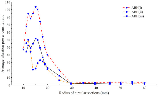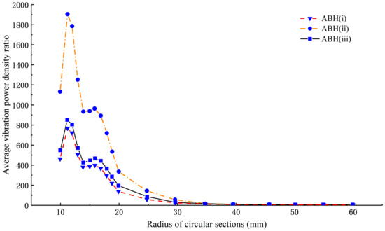 Then, the ratios of average vibration power density at different circular sections of an ABH to that at the reference cross-section of the plate are calculated, and by using this ratio, the focalization characteristics of the vibration energy at circular sections with different radii in the ABH can be analyzed. To investigate the vibration energy distribution with ABH radius under excitation frequency 1000 Hz, 1050 Hz and 1100 Hz, and the influence of natural frequencies, average vibration power density ratios of different circular sections of ABH(i), ABH(ii) and ABH(iii) at the excitation frequency of 1000 Hz, 1002 Hz, 1050 Hz, 1072 Hz, 1088 Hz, and 1100 Hz are shown in Figure 7, Figure 8, Figure 9, Figure 10, Figure 11 and Figure 12 (1002.0 Hz, 1072.1 Hz, and 1088.0 Hz are natural frequencies of the ABH plate).