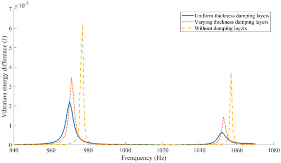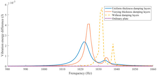 Figure 15 shows that every curve has two peaks, and the vibration energy difference between sections A and B of the plates embedded with the ABH array with different damping layers are obviously higher than that of the uniform plate with damping layers in the range of 980–1060 Hz. This indicates that the energy dissipation efficiency of damping materials is obviously improved because of the ABHs, particularly in the range of 1020–1040 Hz. Besides, for plates embedded with the ABH array, the peaks occur at different frequencies for different damping configurations. This indicates that the damping materials may change the energy distribution of plate embedded with the ABH array in the frequency domain to some extent and reduce the frequency at which the ABH array starts to work. Moreover, due to the energy dissipation of damping layers, the peak energy difference values of the ABH plate with uniform damping layers and the ABH plate with varying thickness damping layers are smaller than that of the ABH plate without damping layers, which means that some energy is dissipated by damping materials. The peak value of the ABH plate with uniform damping layers is smaller than that of the ABH plate with varying thickness damping layers, which indicates that the uniform damping layers have a better energy dissipation effect than varying thickness damping layers in this case.