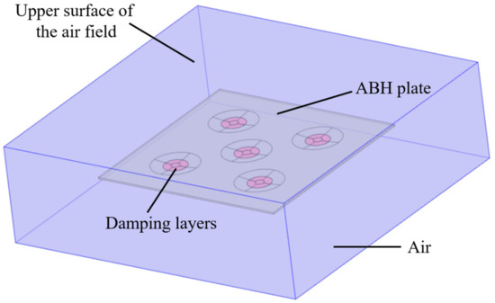 To investigate the sound radiation of the plate embedded with the ABH array with the damping layers, a coupled acoustic-plate system is introduced, as shown in Figure 17, and the averaged sound pressure level of the top surface of the air field is calculated. At the same time, a reference acoustic-plate model embedded with the ABH array but without damping layers is also established and its sound pressure level is also calculated. In this way, the noise attenuation effect can be analyzed. In this paper, sound radiation simulation is carried out in COMSOL. Second-order mesh elements are used for acoustic-structure coupling analysis. The rule of thumb for meshing wave problems is to apply at least five to six second-order mesh elements per local wavelength in order to resolve waves [20,21], so the maximum air element size is set to one-sixth of the wavelength. Besides, the thickness of the air layer is 250 mm and a perfectly matched layer (PML) is used for the boundary treatment to ensure the complete absorption of sound waves at the boundary. The results are shown in Figure 18 (, plate model under BC 1, with uniform thickness damping layers).