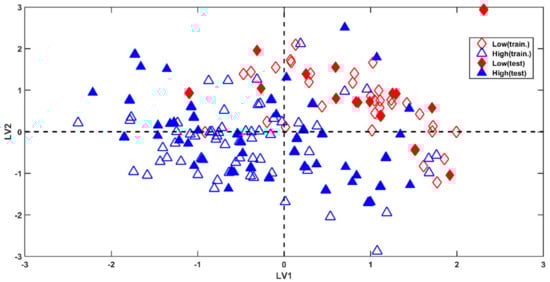 A graphical representation of the results can be seen in Figure 2, where calibration (empty symbols) and validation molecules (filled symbols) have been projected onto the space spanned by the first two latent variables (LVs). From the plot, it is possible to notice a clear grouping tendency among observations belonging to the two classes. In particular, the greatest part of the compounds presenting low permeability (red diamonds) falls at the positive values of both LV1 and LV2; however, high-permeating molecules (blue triangles) spread along LV1, but mainly present negative scores for LV2. This representation does not completely reflect the accuracy of the achieved results (a total accuracy of 93.33%), which corresponds to the misclassification of only five test samples (over 75), all belonging to class high-permeable. Nevertheless, this is due to the fact that the displayed scores plot provides a substandard representation of the results, because it takes into account only the variability modelled by two (over eleven) components.