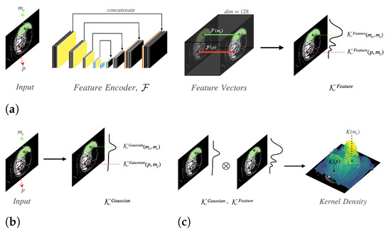 Model architecture that consists of 2 kernels. These kernels are used to compute the kernel density, which has a high value in the region of the target organ: (a) Feature similarity kernel density; (b) Gaussian kernel density; (c) Kernel density.
