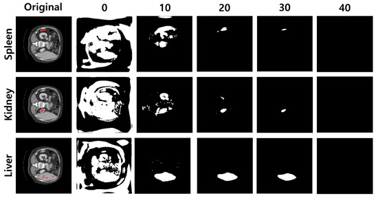 We utilize the BTCV [22] dataset (https://www.synapse.org/#!Synapse:syn3193805/files/, accessed on 1 September 2021). The dataset has 13 organs with segmentation performed by a trained person and reviewed by a radiologist. In this study, we measured the performance through four organs: liver, left kidney, right kidney, and spleen, located in the abdomen. In Figure 1, we provide abdominal CT images of four different people; each organ has its colors and textures, and the positions are relatively similar.
