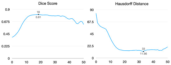 where and mean the cardinality of P and G, respectively. The dice score indicates overlapped area between the segmentation prediction and ground truth, penalizing the missing prediction. In case the model prediction is more similar to ground truth in terms of segmentation size, the dice score is more highly evaluated. The Hausdorff distance is computed as follows: