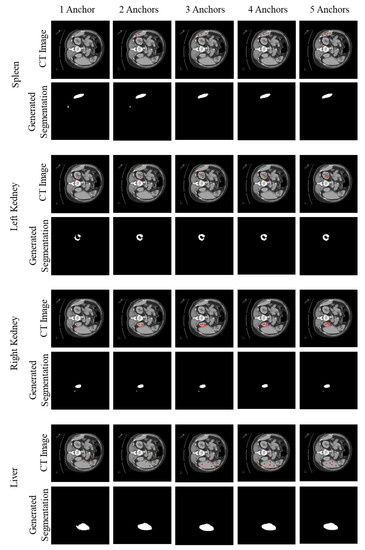 Generally, more anchor pixels give better segmentation than fewer anchor pixels. However, we could find some exceptional cases that fewer anchor pixels show better performance. We analyzed that the position of anchor pixels also affects the performance. For instance, even if we have only one anchor pixel, the segmentation prediction is more accurate when the anchor pixel exists around the center of the organ. If we have more than one anchor pixel, but they are in the boundary, our model tends to capture only a part of the region. Since we automated the process of picking anchor pixels by randomly sampling them from pixels of the organ, the case that some anchor pixels cover the same region or exist in the boundary region frequently occurred.