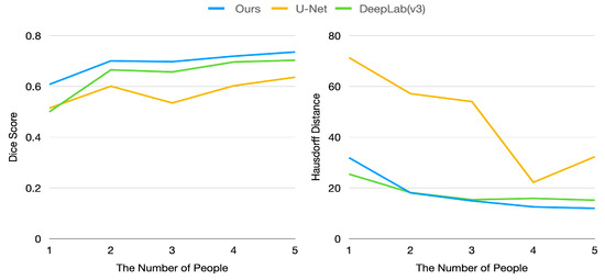 Figure 7 shows the dice score and Hausdorff distance of the proposed model and baseline models. As illustrated in Figure 7, our model is superior to baseline models in terms of dice score. In particular, our model achieved a 0.6 dice score with training data of only one person, whereas baseline models achieved only about 0.5 dice score.