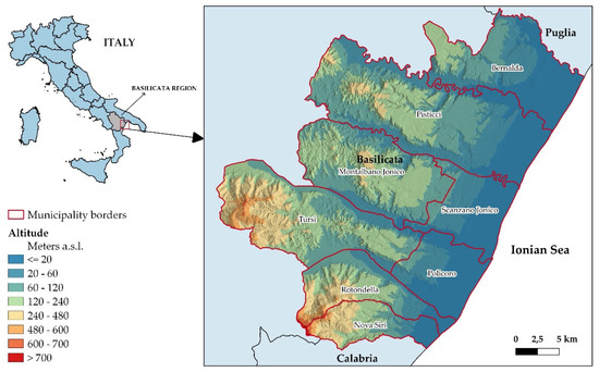 The study area includes some municipalities of the Basilicata Region (Southern Italy) that fall within the “Metapontino” agri-food district (Figure 1). It extends along the Ionian Sea, occupying the coastline for about 35 km. It includes eight municipalities: Bernalda; Montalbano Jonico; Nova Siri; Pisticci; Policoro; Rotondella; Scanzano Jonico, and Tursi.