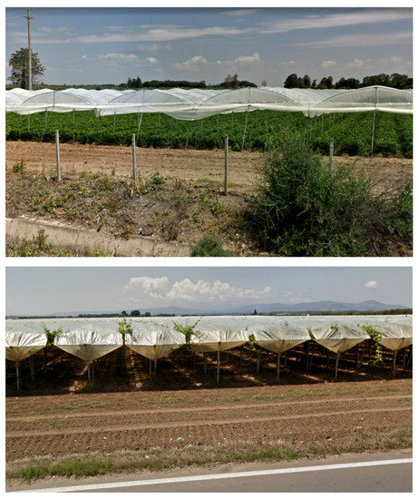 In recent decades, agricultural production has significantly improved, thanks to the increase in land use for agricultural activities to feed growing populations, as well as to the implementation of new technologies [1]. However, it has also increased the impacts on the rural environment, as well as on the natural cycles of the ecosystem [2]. Among the most important of these factors, there is the growing use of new materials such as plastics, which allow for more efficient, easier, and cheaper agricultural productions. Polymers are employed in agriculture in several possible applications, from irrigation (pipes, tubes) to silage, crates, ropes, containers of chemicals for plant protection, etc. One of the most efficient applications is the use of plastic materials for crop protection, aimed to protect cultivations through the use of covers placed over plants while they are growing. The cover provides protection from adverse climatic factors, while at the same time increases yield and/or extends cropping season. In this sense, plastic covers can play a passive effect—protecting the crops from negative weather conditions, dust, animals, birds, insects, etc.—and, at the same time, an active effect, by exploiting solar radiation and realizing a more favorable environment for the cultivations. Plastic films are widespread for covering greenhouses, low and medium tunnels, and for soil mulching. Shading nets for greenhouses, or nets for the modification of the microenvironment, or for protection against hail and wind, are employed for a large variety of crops (horticulture, vineyards, orchards). Films and nets are also used in joint combination for the protection against virus-vector insects and birds as standalone cover or in connection with structures for the growing of horticultural and arboreal cultivations [3,4,5]. According to the most recent data, the consumption of plastics in agriculture has reached 1.7 million tons in 2017 in the EU [6], distributed mainly between greenhouse and tunnel films, nets, and mulch films.