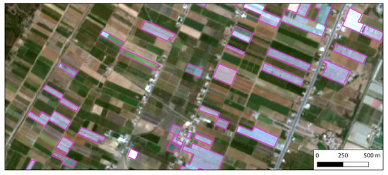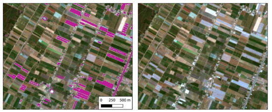 Satellite images were downloaded through the Theia system, which provides ortho-rectified surface reflectance images after atmospheric correction. Two images (9 and 26 July 2017) were used to verify the presence of plastic films, avoiding errors due to the temporary absence of greenhouse cover.
