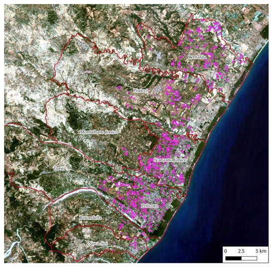 From analysis of the elaborations summarized in Table 2, it emerges that about 2000 hectares of APS are concentrated in the four municipalities of Pisticci, Policoro, Scanzano Jonico, and Bernalda. At the overall level, the APSs occupy 2.25% of the total study area, that is, a 4.43 % of the total agricultural area. Since the complete classification of land cover has not been carried out, a different dataset [35] has been used only to make a descriptive statistical comparison for a general evaluation.