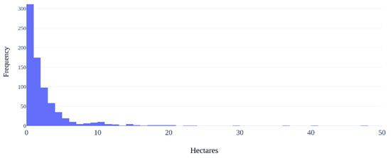 For an analysis of the frequency distribution of the single plastic covers, a histogram (Figure 6) was realized automatically in a GIS environment, showing how the single patches of identified plastic covers are distributed. From the analysis, it emerges that most of them do not exceed 10 hectares and that the largest number of polygons identifying plastic are in the first class of distribution (less than 1 ha). These data, at the planning level, show that there is not high spatial continuity in the APSs, and the total area is distributed mainly on small agricultural plots.
