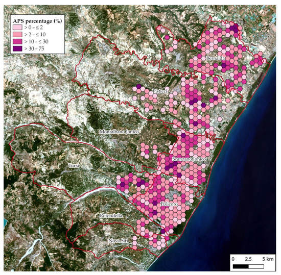 However, for a more precise analysis of the distribution of the quantity of APS present in the study area, the interpolation of the APS within the hexagonal grid made it possible to identify the areas with the greatest APS concentration. The aps concentration within cells was divided into percentage classes with a maximum value found of 75%. From this methodology of analysis (Figure 7), it is clear that the distribution within municipalities is different because the APSs are distributed exclusively in the portions closer to the coast and flat.