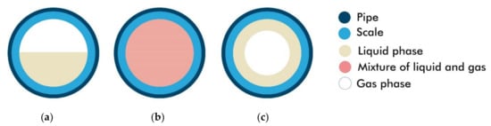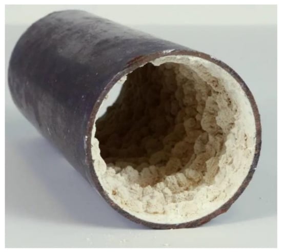 One of the studies conducted years ago to flow metering and determine volume percentage was a study published in 1999 by Abro et al. [1]. Determination of void fraction was done by Abro et al. using low-energy gamma-ray Americium-241 instead of the traditional Caesium-137 source. They tried to determine which detector positions best serve the purpose and placed three detectors at angles of 140-degree, 154-degree, and 180-degree to the source. The EGS4 software package has been chosen as a substrate for volumetric percentage determination with a 3% error for all flow regimes. In 2020, Sattari and his colleagues were able to simulate three common flow regimes in the volumetric percentage of 5–90% using a structure containing a detector and a cesium-137 source [2]. They performed two independent GMDH neural networks to detect volume percentages and flow regimes. In the beginning, they passed the photon spectrum extracted from the detector through a Savitzky–Golay filter to eliminate the existing high-frequency noise, then extracted 7 time-domain characteristics from this spectrum to give them as input of the neural network. This approach could eventually achieve the type of flow regimes and volume percentage prediction with a root mean square error of less than 1.11. Some studies in recent years have shown that gamma radiation can be used as a technique to detect these internal deposits in oil and gas pipelines. Oliviera et al. used a structure with a NaI detector and a source of cesium-137 to inspect the scale deposited pipe in 2015 [3]. In the discussed approach, the detector and the source move simultaneously in 0.5 cm increments. At each stop, the detector records the gamma spectrum passed through the pipe for one minute. The results showed that the presence and thickness of scale in the pipe could be predicted. In reference [4], the researchers simulated three flow regimes in different volumetric percentages and scale thickness inter the pipe; they were able to classify flow regimes with not very high accuracy using SVM neural network and predicted volumetric percentages with an RMSE of less than 3.67 using the MLP neural network. In addition, in a similar study [5], an attempt was made to predict the scale thickness in the pipe independent of the flow regime and volume percentage using the RBF neural network with an RMSE of less than 0.22. Radiation multiphase flowmeters and the applications of artificial intelligence in them can be found in other studies that are available in references [6,7,8,9,10,11,12,13,14,15]. Oil and gas pipelines may become internally fouled and have devastating effects. These deposits can reduce the internal diameter, reduce the equipment life cycle, reduce efficiency, and, ultimately, increase costs [16]. The scale deposited in a pipeline is depicted in Figure 1.