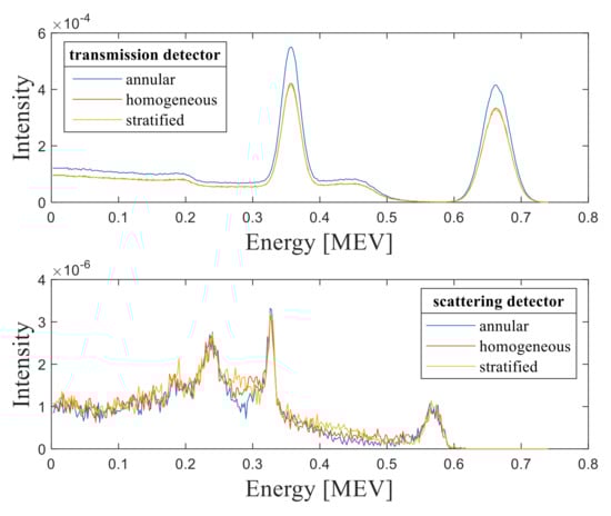 In the source part, a dual-energy gamma source, including radioisotopes of Cesium-137 and Barium-133 was used, which radiate 0.662 MeV and 0.356 MeV, respectively. In the proposed structure, scattered and transmitted photons are received by two 25.4 mm × 25.4 mm NaI detectors. The detector, which is responsible for recording transmitted photons, was located on the other side of the pipe just opposite the photon transmitter source. The other detector, which is responsible for receiving the scattered photons, was located at a 45-degree angle with the hypothetical line connecting the center of the pipe to the transmission detector. The pipe was considered in this simulation is made of steel with an inner diameter of 20 cm. The scale on the inner wall of the pipe was intended as a circular symmetrical layer of BaSO4 with different thicknesses. Three types of flow regimes with annular, stratified, and homogeneous names were simulated in volume percentages between 10% to 85% with steps of 15% and in seven different scale thicknesses. In our previous work [18], the structure discussed in this article had been validated by several experiments. The obtained detector responses were compared in experimental and simulation. The results showed a good agreement between the simulated results and the experimental data. The uttermost relative difference between the experimental data and simulated data for the detector response was 2.2%. The actual working conditions were dynamic; however, the reference points for flowmeter training were fixed and can be considered static, so experiments and simulations were performed in static conditions. These fixed points were used for flowmeter training to determine the volume fraction and to detect flow regimes in multiphase flowmeters in real conditions. Swift gamma-ray neutron active analysis was considered for quantitative analysis for swift, non-intrusive and online measurements of multiphasic seawater/gas/oil flows in [19]. In this research, all simulations have been considered in static conditions but have been used in real conditions. In [20], conceivable use of transmitted and scattered gamma radiation detection for the characterization of produced water from offshore oil wells has been evaluated. The simulated flow regimes are illustrated in Figure 3. Figure 4 depicts the spectra recorded for three flow regimes with a scale thickness of 2 cm and a void fraction of 55% in both detectors.