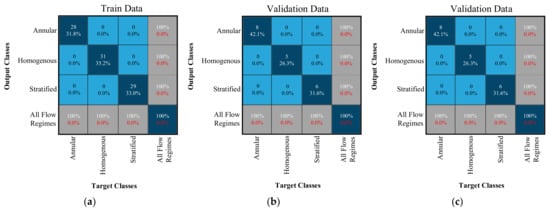In this paper, two separate artificial multilayer perceptron neural networks are designed to classify the type of flow regimes and predict the volume percentages independent of the thickness of the scale in the pipe. The inputs of both networks are the characteristics introduced in the previous section- extracted from the recorded signals from both the TD and the SD. In total, 126 simulations were performed in this study, of which about 70% (88 samples), 15% (19 samples), and 15% (19 samples) were used for training, validation, and testing data, respectively. The structure of the classifier network to identify the type of flow regimes is shown in Figure 5. To show the performance of this network, the confusion matrix is plotted for train, validation, and test data in Figure 6. It is very important to say that the output of this network consists of three numbers, 1, 2, and 3, which represent the annular, stratified, and homogeneous regimes, respectively. In addition, the thresholds for the output of this network are defined in such a way that if the output was between 0.5 to 1.5, the output number would be equal to 1, if the output number was between 1.5 to 2.5, the output would return to 2 and if the output was between 2.5 to 3.5, the network declares a homogeneous regime in the output.