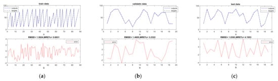 Fitting and error diagram to show the predictor network performance for (a) training, (b) validation and (c) testing data.