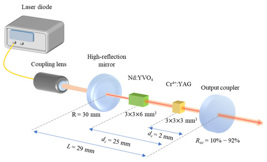 To verify the model, we set up a concave-plano cavity for the PQS operation, and the experimental scheme is shown in Figure 1. The pumping source was a fiber-coupled laser diode with a core diameter of 0.2 mm, which was able to offer a maximum power of 40 W at 808 nm. The pumping energy from the laser diode was configured as pulse-pumping with the frequency 10 kHz and duty cycle 30% for reducing the thermal lensing effect. The input side of the resonator was a concave mirror with a radius of curvature 30 mm, and its entrance facet was coated anti-reflection films at 808 nm with reflectivity less than 0.1%; the second facet was coated high-reflection films at 1064 nm with reflectivity 99.8% and transmittance 96% at 808 nm. Since our model was based on the condition of no gain saturation, we chose a low-doped concentration 0.3 at. % Nd:YVO4 as the gain medium to avoid saturation cases. Furthermore, the gain medium was an a-cut rectangular crystal with the dimensions of mm3, and both ends were coated anti-reflection films at 1064 nm with reflectivity less than 0.1%. The saturable absorbers were two Cr4+:YAG with the initial transmission and 50%, and both were rectangular crystals with the dimensions of mm3. The coating for the absorbers on both ends were the same as those of the gain medium. The gain medium and the saturable absorbers were wrapped with indium foils and mounted in copper holders that were connected to a water-cooling system keeping a temperature of 22 °C. The indium foils were used as high-efficiency heat sinks and filling material for tiny gaps between the crystal and the holder. Several flat mirrors with different reflectivity in a range from 10% to 92% were employed as the output couplers in this experiment. The distance in Figure 1 is the average distance from the output coupler to the gain crystal, and is the distance from the output coupler to the absorber.
