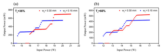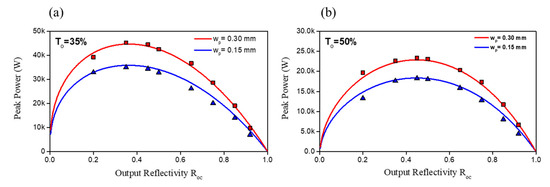 and the space-related terms S and are included in the maximum photon number . The theoretical fitting and experimental results for the peak powers are shown in the Figure 5 for the cases mm and mm with . The peak powers for both pumping foci possess the similar pattern to that of the output energies owing to the spatial overlap effect too. From that, again, we see the good agreement between the theoretical fitting and experimental results.