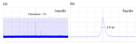 Figure 3 shows a typical stable pulse train and the pulse width of a single pulse with time span division of 8 ms and 40 ns in the case of to the frequency-locked states of 1:1, i.e., frep = 10 KHz. The overall pulse-to-pulse amplitude fluctuation was found to be within 5%. The pulse duration was measured approximately to be 2 ns, as shown in Figure 3b. We also observed that there was no additional pulse or satellite pulse in every single Q-switched shot.