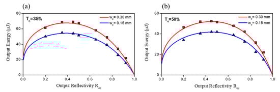 The output energy versus the output coupler reflectivity of the theoretical fitting and the experimental results with for two pumping foci are shown in Figure 4a. It can be clearly seen that the values of the curve of the case mm is higher than that of the case mm by a factor of 1.25 on average, which is exactly corresponding to the ratio of the energy factor 65 μJ to the energy factor 52 μJ. The results for other cases of is also shown in Figure 4b. The agreement of the theoretical calculations and the experimental data confirms the validity of the developed spatial model.