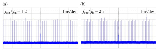 The pulse trains at frequency ratios (a) fout/fin = 1/2 and (b) fout/fin = 2/3 for the case mm, , with pulse-pumping frequency 10 kHz.