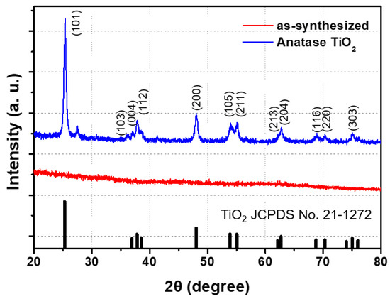 To investigate the crystal structures of the synthesized TiO2, X-ray diffraction (XRD) patterns were obtained from the TiO2 NS-powder and analyzed. As shown in Figure 1, there were no XRD peaks for the as-synthesized TiO2 NSs, but after heat treatment, XRD peaks were clearly shown and well-corresponded with the crystal planes of (101), (004), (200), (105), (211), (204), (116), (220), (215), and (303) of anatase TiO2 (JCPDS No. 21-1272) [23]. Consequently, we confirmed that the synthesized amorphous structure of the TiO2 NS was successfully crystallized to an anatase structure after heat treatment.