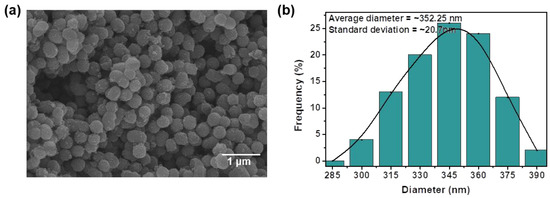 To fabricate the new TIM structure, we used a PDMS matrix, TiO2 NS-filler, and TiO2 NS-monolayer. The detailed experimental condition and fabrication processes are described in the materials and methods section. To verify the morphology of the synthesized anatase TiO2 NS, field emission scanning electron microscope (FESEM) measurements were conducted. The synthesized anatase TiO2 NSs showed a spherical shape with diameters of several hundreds of nanometers, as shown in Figure 3a. The diameter distribution of the synthesized TiO2 NSs is shown in Figure 3b, and the average diameter from the diameter distribution is about 352.25 ± 20.7 nm, showing that the synthesized TiO2 NSs have uniform sizes.