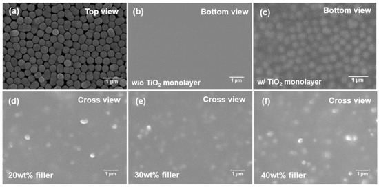 To observe the morphology changes of TiO2 NS-based TIMs, FESEM measurements were conducted with various directions of the fabricated TIM samples, as shown in Figure 4. Figure 4a shows the transferred TiO2 NS-monolayer on the rigid support substrate. Figure 4b,c shows the bottom view of PDMS with and without the TiO2 NS-monolayer, respectively. As shown in Figure 4c, it can be confirmed that the TiO2 NS-monolayer was successfully embedded in PDMS, which is clearly seen from Figure 4b. The loading fractions of the TiO2 NS-filler in PDMS were adjusted to 20 wt%, 30 wt%, and 40 wt%, which can be converted to 5.3 vol%, 8.8 vol%, and 13.2 vol% as volume ratios, respectively. Figure 4d–f shows the FESEM cross-sectional images of the fabricated TIMs with different TiO2 NS contents, and the occupancy of TiO2 NS particles according to the change of loading fraction in PDMS can be roughly classified. From the cross-sectional views of the SEM, it should be noted that TiO2 NSs are uniformly distributed inside the PDMS for all embedded conditions.