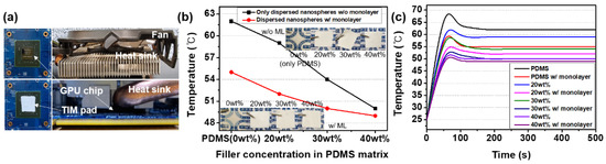 The fabricated TIMs consisting of the TiO2 NS-filler/monolayer embedded PDMS were attached to the actual GPU chipset to investigate the heat dissipation characteristics. Figure 5a shows the optical photographs of the GPU chipset, fabricated TIMs, heat sink, and cooling fan for the heat dissipation characteristic measurements.