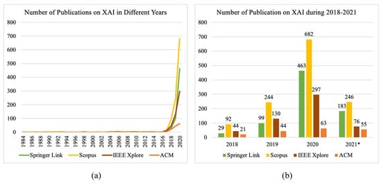 Upon realising the need to explain AI/ML model-based intelligent systems, a few researchers started exploring and proposing methods long ago. The bibliographic databases contain the earliest published evidence on the association between expert systems and the term explanation from the mid-eighties []. Over time, the concept evolved to be an immense growing research domain of explainable artificial intelligence (XAI). However, researchers did not pay much attention to XAI until 2017/2018 which can be justified by the trend of publications per year with the keyword explainable artificial intelligence in titles or abstracts from different bibliographic databases illustrated in Figure 1a. The increased attention paid by researchers towards XAI from all the domains utilising systems developed with AI/ML models was caused by three major incidents. First of all, the funding of the “Explainable AI (XAI) Program” was funded in early 2017 by the Defense Advanced Research Projects Agency (DARPA) []. After a couple of months in mid-2017, the Chinese government released “The Development Plan for New Generation of Artificial Intelligence” to encourage the high and strong extensibility of AI []. Last but not least, in mid-2018, the European Union granted their citizens a “Right to Explanation” if they were affected by algorithmic decision making by publishing the “General Data Protection Regulation” (GDPR) []. The impact of these events is prominent among the researchers since the search results from the significant bibliographic databases depict a rapidly increasing number of publications related to XAI during recent years (Figure 1b). The bibliographic databases that were considered to assess the number of publications per year on XAI were found to be the main sources of the research articles from the AI domain.