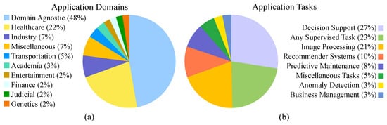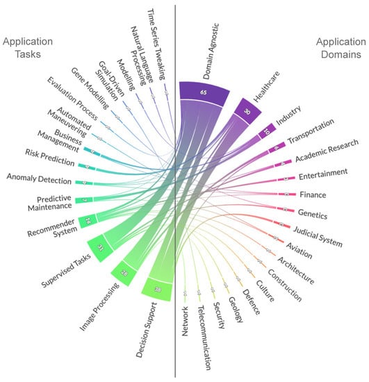 To gain an idea of the research areas that have been enhanced with XAI, the application domains and tasks were scrutinised. The number of articles on different domains and tasks are illustrated in Figure 2. Among the selected articles, approximately of the publications were domain-agnostic. Half of the remaining articles were published in the domain of healthcare. Other domains of interest among XAI researchers were found to be industry, transportation, the judicial system, entertainment, academia, etc. Table 4 presents the application domains and corresponding tasks on which the selected articles substantially contributed. It is evident from the content of the table that most of the published articles were not specific to one domain, and safety-critical domains, such as healthcare, industry, and transportation, received more attention from XAI researchers than domains, such as telecommunication and security. Some domains can be clustered together in a miscellaneous domain because of the small number of articles (as can be seen in Figure 2a). In the case of application tasks, most of the selected articles were published on supervised and decision-support tasks. A good number of works have been published on recommendation systems and systems developed on image processing tasks, e.g., object detection and facial recognition. Other noteworthy applications in the selected articles were predictive maintenance and anomaly detection. It was also observed that several articles presented works on supervised tasks, i.e., classification or prediction without specifying the application. Moreover, very few articles have been published on modelling gene relationships, business prediction, natural language processing, etc. Figure 8 presents a chord diagram [] illustrating the distribution of the articles published from different application domains for various tasks. Most of the studies not specific to one domain were for decision support and image processing tasks.