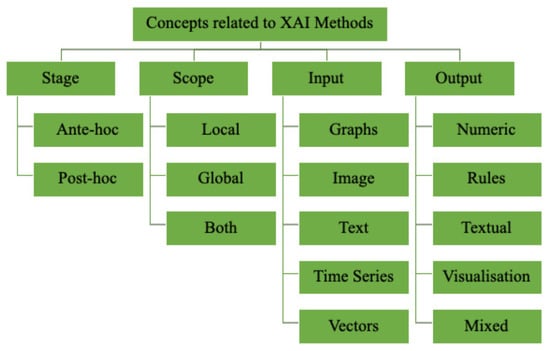 This section concisely presents the theoretical aspects of XAI from a technical point of view for a better understanding of the contents of this study. Emphatically, the philosophy and taxonomy of XAI have been excluded from this manuscript because they are out of the scope of this study. However, the term explainability is associated with the interface between decision makers and humans. This interface is synchronously comprehensible to humans and accurately represents the decision maker []. Specifically, in XAI, the interface between the models and the end-users is called explainability, through which an end-user obtains clarification on the decisions that the AI/ML model provides them with. Based on the literature, the concepts of XAI within different application domains are categorised as stage, scope, input and output formats. This section includes a discussion on the most relevant aspects that seem necessary to make XAI efficiently and credibly work on different applications. Figure 3 summarises the prime concepts behind developing XAI applications which were adopted from the recent review studies by Vilone and Longo [,].