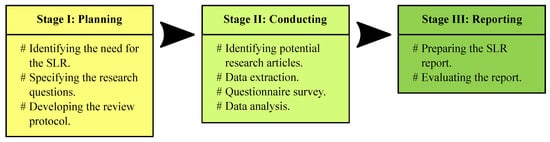 The methodology was designed according to the guidelines provided by Kitchenham and Charters for conducting an SLR []. The guidelines contain clear and robust steps for identifying and analysing potential research works intending to consider future research possibilities followed by the proper reporting of the SLR. The SLR methodology includes three stages: (i) planning the review; (ii) conducting the review; and (iii) reporting the review. The SLR methodology stages are briefly illustrated in Figure 4. The first two stages are broken down into major aspects and described in the following subsections, while the third stage, reporting the SLR, is self-explanatory.