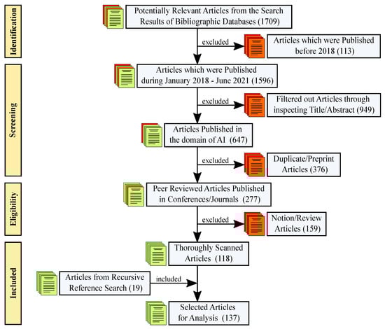 The process for identifying potential research articles included the identification, screening, eligibility, and sorting of the selected articles. A step-by-step flow diagram of this identification process is illustrated using the “Preferred Reporting Items for Systematic Reviews and Meta-Analyses” (PRISMA) diagram by Moher et al. [] in Figure 5. The process started in June 2021. An initial search was conducted using Google Scholar (https://scholar.google.com/ accessed on 30 June 2021) with the keyword explainable artificial intelligence to assess the available sources of the research articles. The search results showed that most of the articles were extracted from SpringerLink (https://link.springer.com/ accessed on 30 June 2021), Scopus (https://www.scopus.com/ accessed on 30 June 2021), IEEE Xplore (https://ieeexplore.ieee.org/ accessed on 30 June 2021) and the ACM Digital Library (https://dl.acm.org/ accessed on 30 June 2021). Other similar sources were also present, but those were not considered since they primarily indexed data from the mentioned sources. Moreover, Google Scholar was not used for further article searches since it was observed that the results contained articles from diverse domains. In short, to narrow the search specifically to the AI domain, the mentioned databases were set to be the main sources of research articles for this review. Initially, 1709 articles were extracted from the bibliographic databases after searching with the keyword explainable artificial intelligence, as before. To focus this review on the recent research works, 113 articles were excluded because they were published before 2018. A total of 1596 articles were selected for screening, and after reviewing the titles or abstracts, more than half of the articles were excluded as they were not related to AI and XAI. From the 647 articles screened from the AI domain, 376 articles were excluded as they were duplicates or preprint versions of the articles. After evaluating the eligibility of the published articles, 277 articles were further considered, and 159 articles were excluded because they were notions or review articles. Specifically, a “yes” was provided for the selected articles for at least 7 out of the 10 quality questions mentioned in Table 2 following Dáu and Salim [] and Genc-Nayebi and Abran []. Therefore, 118 articles were selected for a thorough review. During the process, 19 additional related articles were found from a complementary snowballing search [], in simpler terms, a recursive reference search. Among the newly included articles, some were published prior to 2018 but were included in this study due to substantial contribution to the XAI domain. Finally, 137 articles were selected for the authors’ survey, data/metrics extraction and analysis, among which 128 articles described different methodologies of XAI and 9 articles were solely related to the evaluation of the explanations or the methods to provide explanations.