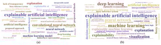 Word cloud of the (a) author-defined keywords and (b) keywords extracted from the abstracts through natural language processing. The font size is proportional to the number of occurrences of the terms and different colours are used to discriminate terms with equal font size. Both figures illustrate remarkable terms of XAI. However, the terms from keywords are more conceptual whereas the abstracts contained specific terms on the methods and tasks.