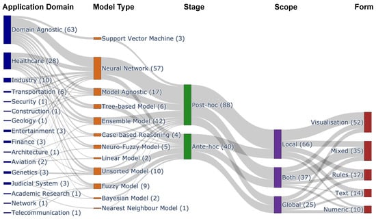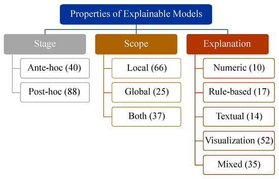 The AI/ML models learn the fundamental characteristics of the supplied data and subsequently try to cluster, predict or classify unseen data. The stage of explainability refers to the period in the process mentioned above when a model generates the explanation for the decision it provides. According to Vilone and Longo, the stages are ante hoc and post hoc [,]. Brief descriptions of the stages are as follows: