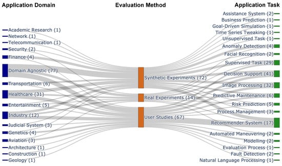 Above all, several review studies were conducted by Vilone and Longo to gather and present the recent developments in XAI [,,]. These studies presented extensive clustering of the XAI methods and evaluation metrics, which makes the studies more robust than the other review studies from the literature. However, none of these studies presented insights on the application domains and tasks that are facilitated with the developments of XAI. However, researchers from specific domains also surveyed the possibilities and challenges from their perspectives. The literature contains most of the works from the medical and health care domains [,,,,,,]. However, there are review articles available in the literature from the domains of industry [], software engineering [], automotive [], etc.