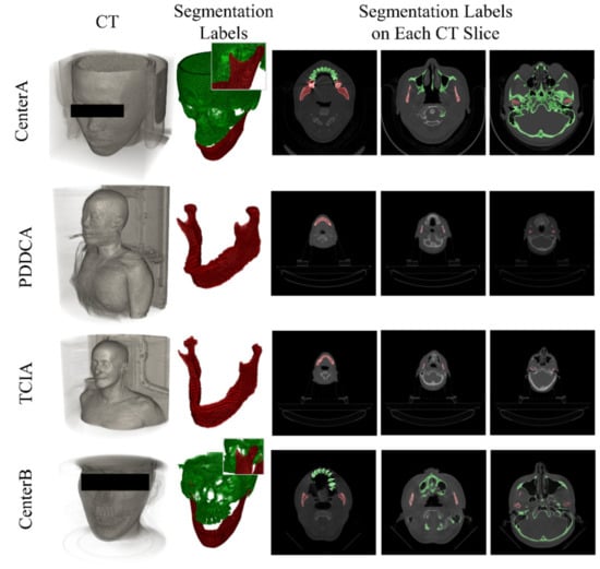 Segmentation of the craniomaxillofacial bones, such as the mandible and maxilla, in computed topography (CT) images is one of the crucial steps for generating three-dimensional (3D) models that are required for the diagnosis and treatment planning of craniomaxillofacial deformities, craniofacial tumor resection, or free flap reconstruction of the mandible [1,2]. Additionally, 3D segmentation of organs at risk (OARs) in head and neck (H&N) CT including the mandible is a critical step in radiotherapy planning for H&N cancer treatment [3].