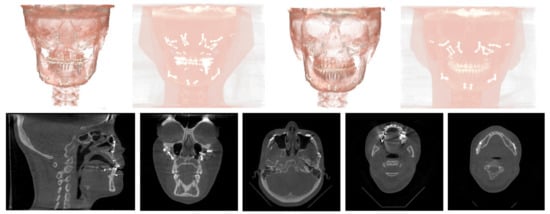 The conventional segmentation task is performed manually using professional software, which is labor-intensive and time-consuming in clinical practice [4,5]. Additionally, manual segmentation has limitations such as low reproducibility and operator variability. Moreover, accurate segmentation of head CT is challenging owing to the complexity of the anatomical structures, the low contrast of soft tissue, artifacts caused by mental implants, and variations between individual patients [6]. In specific, weak and false edges of condyles appearing in CT images adversely affect the accurate segmentation of the mandible [7]. Figure 1 shows examples of the difficulties in segmenting the mandible and maxilla.