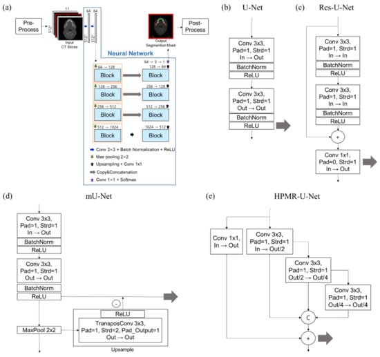 Overall framework and block architectures of neural networks. (a) Overall framework. The numbers above the boxes refer to the channel number of the feature maps. The orange boxes for each neural network are represented in (b–e), with (b) block architecture of U-Net, (c) block architecture of Res-U-Net, (d) block architecture of mU-Net, and (e) block architecture of HPMR-U-Net.
