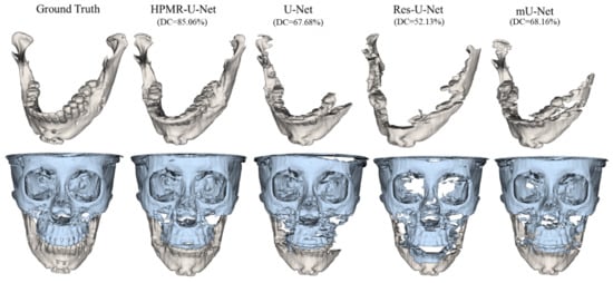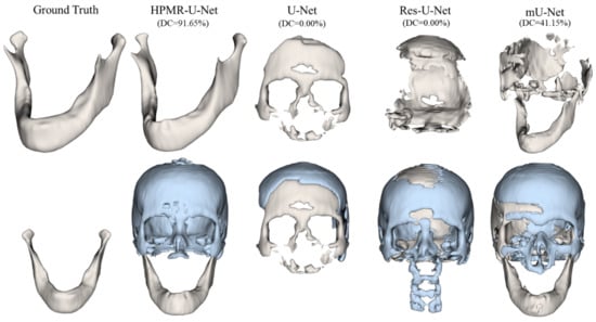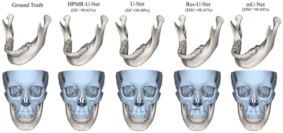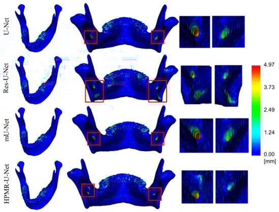 Figure 9 shows rendered color maps in 3D for the distance from the ground truths to the output segmentations of the best DC case for the mandible in CenterA dataset to thoroughly examine the differences among the model outputs for this dataset. There were no significant differences, but the distances in the mandibular foramen were slightly different. This part is challenging to segment accurately owing to its small size, and the distance was less in the outputs of HPMR-U-Net than the other models.