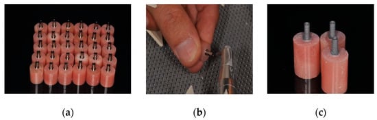 Preparation of samples: (a) implant insertion into the resin supports, (b) sandblasting of abutments, and (c) evidence of the sandblasting process.