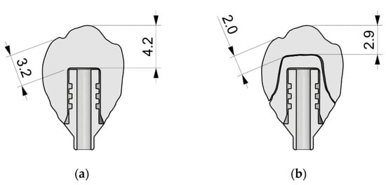In group 2, the forces applied to the occlusal surface are concentrated on the titanium abutment roof, acting as a wedge against the internal composite crown. The load forces are not discharged in a uniform manner on the titanium abutment, resulting, as discussed in [], in mechanical conditions (i.e., sharp edges/fillets) that allow the propagation of cracks, which increase during load cycles, until sample failure. Therefore, the shape of the titanium abutment determines premature failure of the samples rather than the material itself.