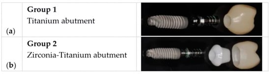 - Stimmelmayr, M.; Sagerer, S.; Erdelt, K.; Beuer, F. In Vitro Fatigue and Fracture Strength Testing of One-Piece Zirconia Implant Abutments and Zirconia Implant Abutments Connected to Titanium Cores. Int. J. Oral Maxillofac. Implant. 2013, 28, 488–493. [Google Scholar] [CrossRef] [Green Version]